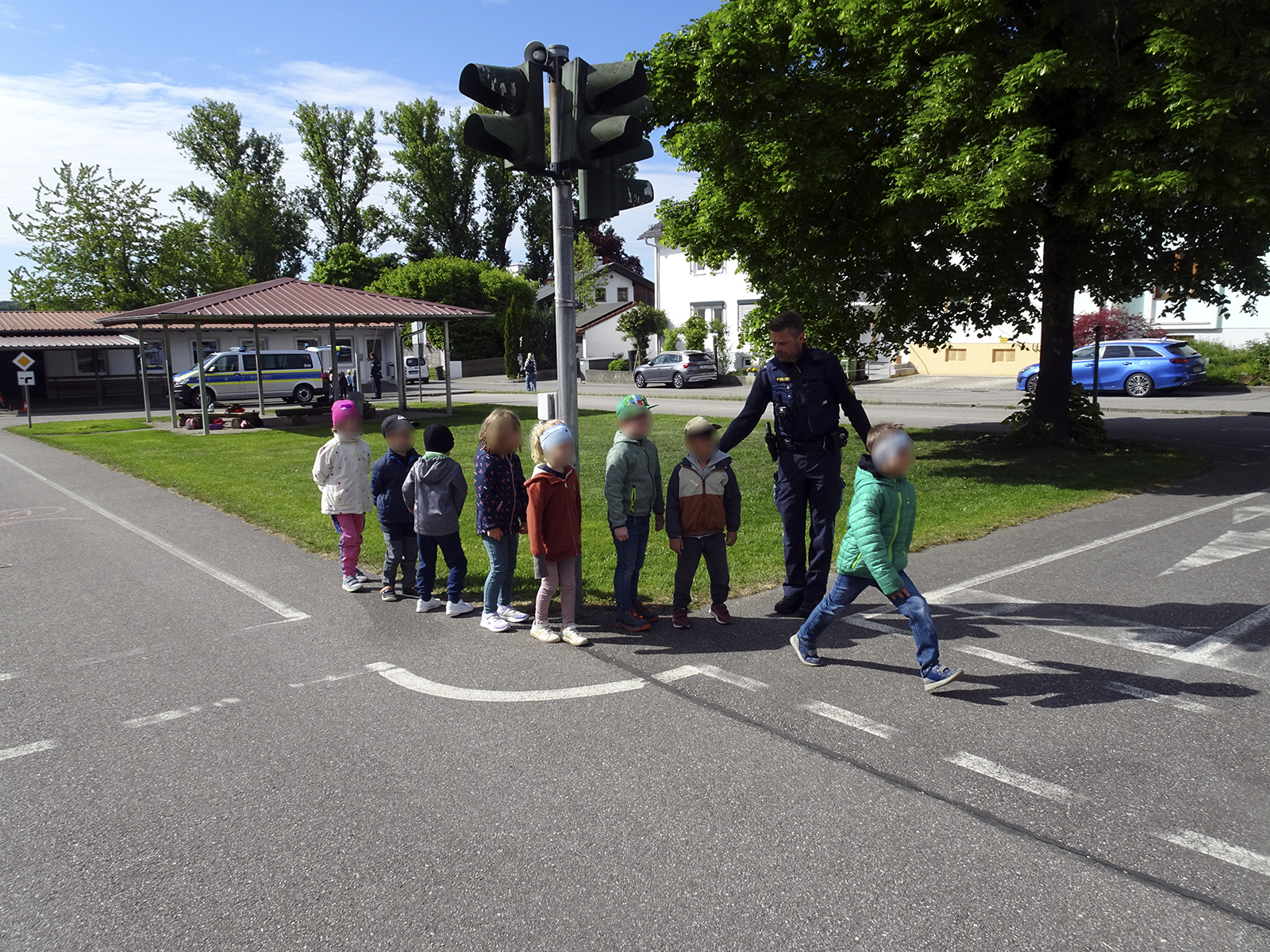 Begrüßt wurden die Kinder von Polizisten, die kindgerecht erklärten, warum Sichtbarkeit und Aufmerksamkeit im Straßenverkehr so wichtig sind und wie man sich an der Ampel und am Zebrastreifen verhält. Auch die Verkehrszeichen wurden vorgestellt und besprochen.